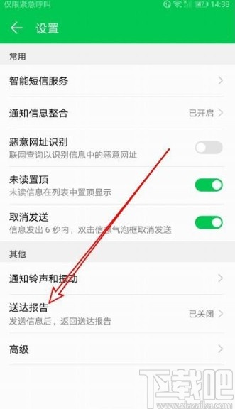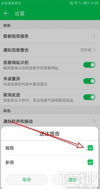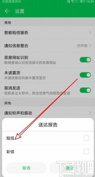 4.点击这个送达报告之后会出现送达报告的设置界面,在其中可以看到有短信和彩信两种送达报告的方式。