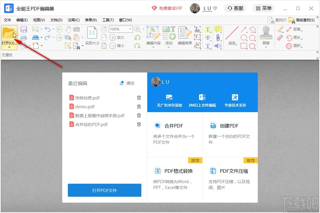 1.首先第一步我们打开软件之后,在软件界面的左上角,找到打开按钮之后点击它准备选择想要打开操作的PDF文件。