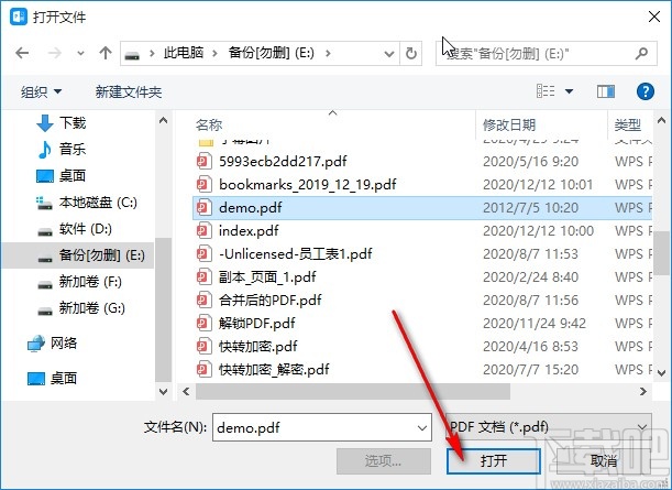 2.打开选择文件的界面之后,在出现的界面中我们找到目标PDF文件之后,选中这个文件,点击右下角的打开按钮。