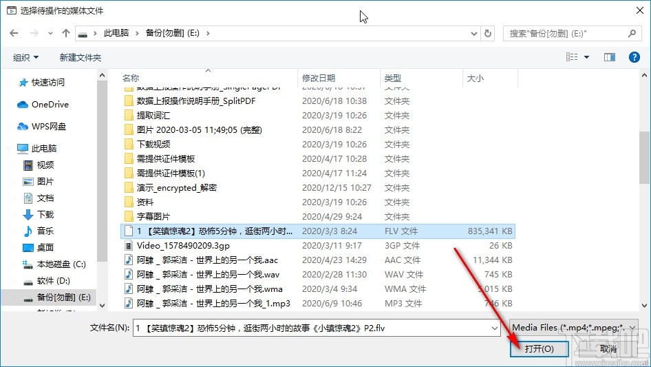 2.点击这个打开按钮之后,接下来下一步就进入到一个选择文件的界面了,在这个界面中我们选中目标视频文件之后,点击右下角的打开按钮。