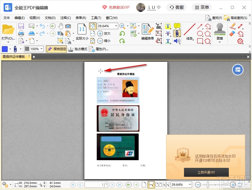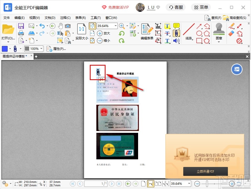 4.接下来找到这个工具的图标,点击选中之后鼠标光标就变成下图所示的十字样式了,然后需要点击PDF页面中想要添加附件文件的位置。