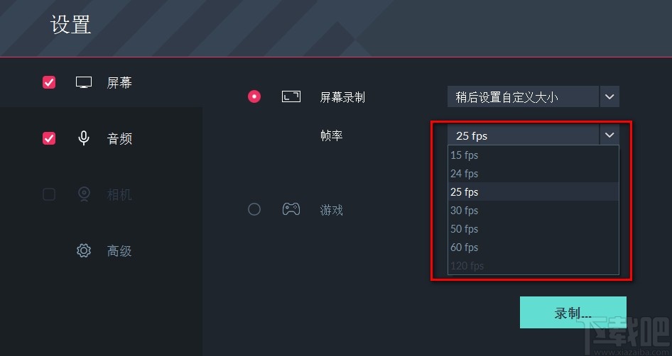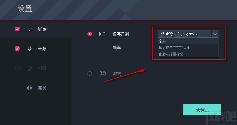 2.在设置页面中,我们在页面上选中“屏幕录制”选项,并点击其后面的下拉按钮,在下拉框中选择“稍后设置自定义大小”选项。