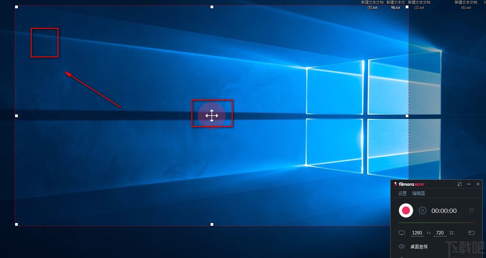 6.接下来我们就会看到下图所示的界面,可以拖动录屏框四周的白色矩形调整录屏框的大小;也可以拖动框中间的移动按钮,移动录屏的位置。