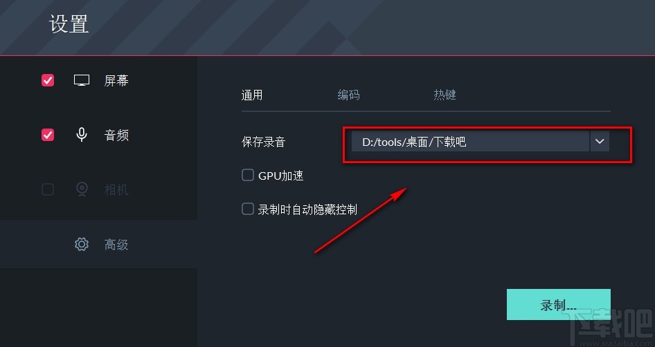 5.紧接着在界面左侧点击“高级”选项卡,并在界面上方点击“保存录音”选项后面的下拉按钮设置保存位置,再点击界面右下角的“录制”按钮就可以了。