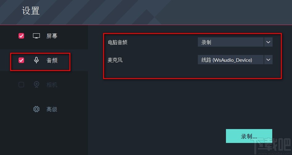 4.然后在界面左侧点击“音频”选项,并根据自己的需要,在界面上对“电脑音频”、“麦克风”等参数进行设置。