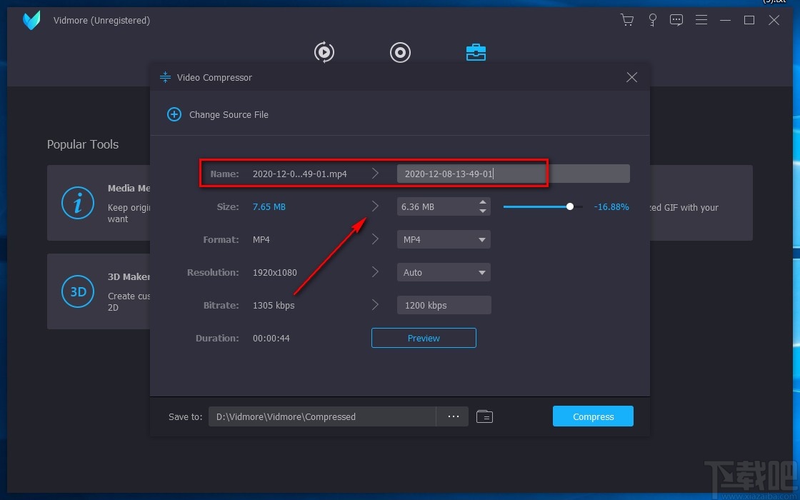 5.随后我们就可以看到下图所示的窗口,我们在窗口中找到“Name”选项,在该选项后面的文本框中输入压缩后的视频名称。