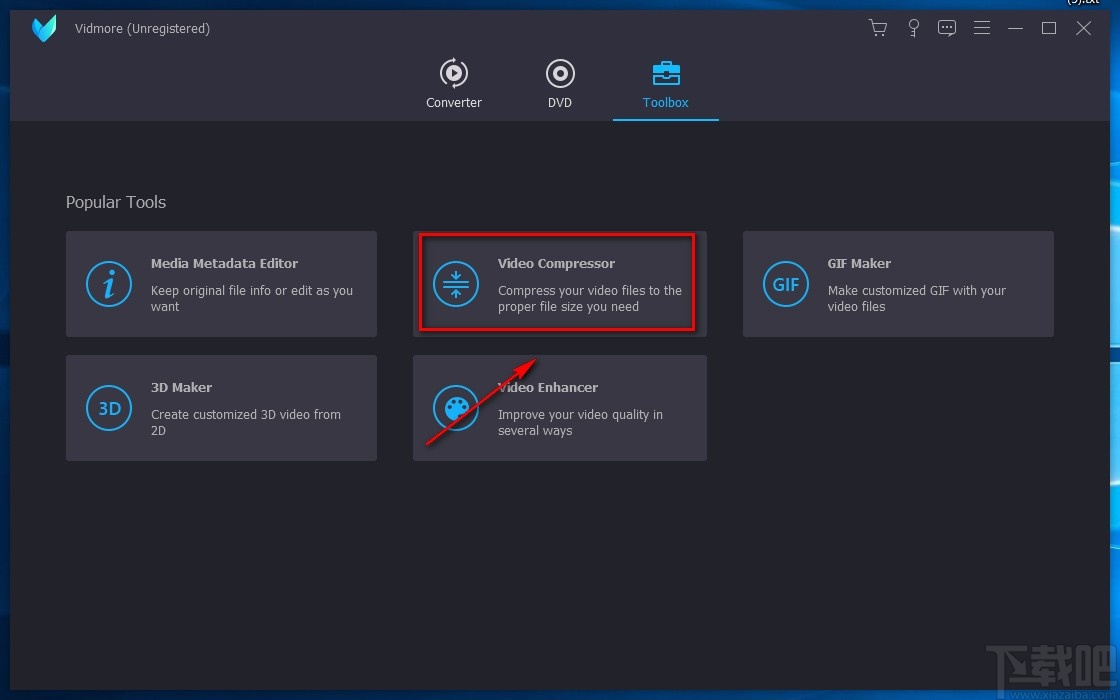 2.接着我们在界面上方找到“Video Compressor”选项,该选项表示视频压缩的意思,点击该选项打开视频压缩窗口。