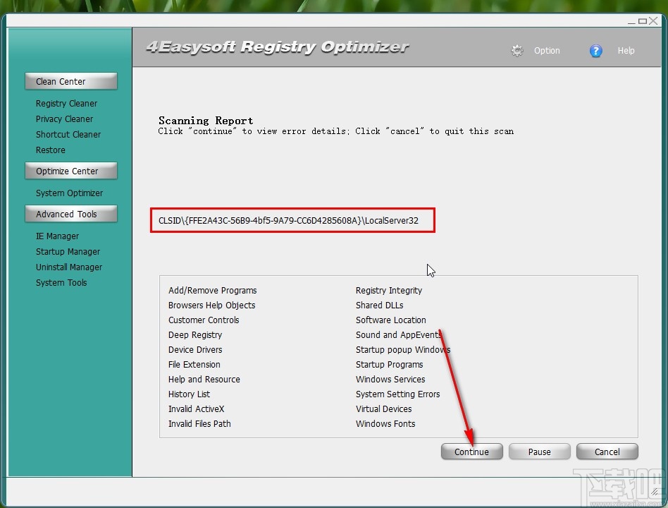 2.点击这个按钮之后软件就会开始扫描操作了,然后我们在界面中可以看到扫描的一些文件注册表路径闪动,等到扫描完成之后点击下方的Continue这个按钮进入下一步。