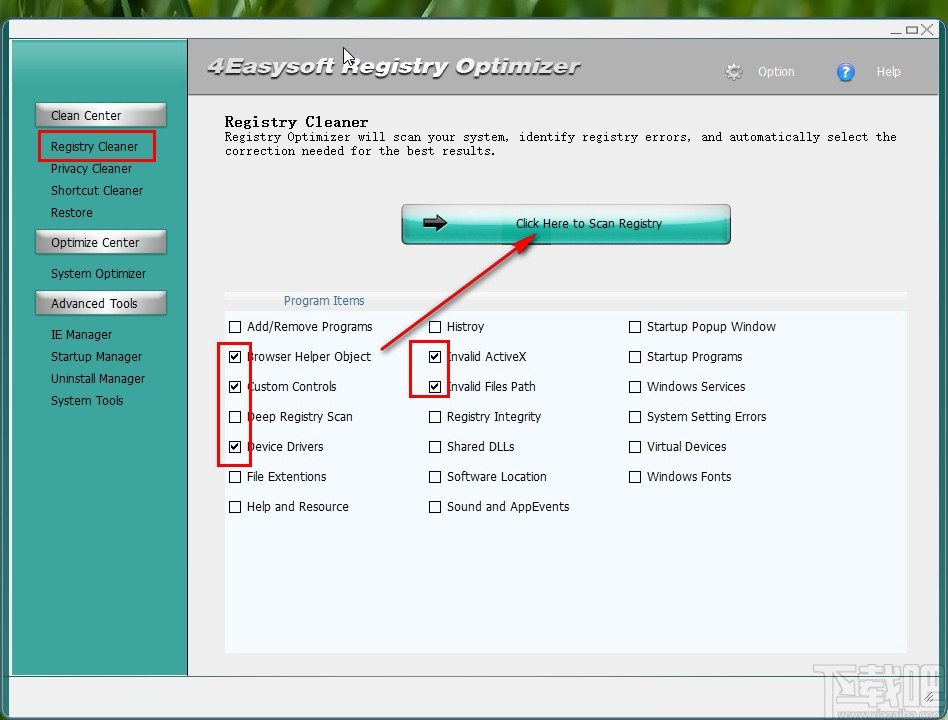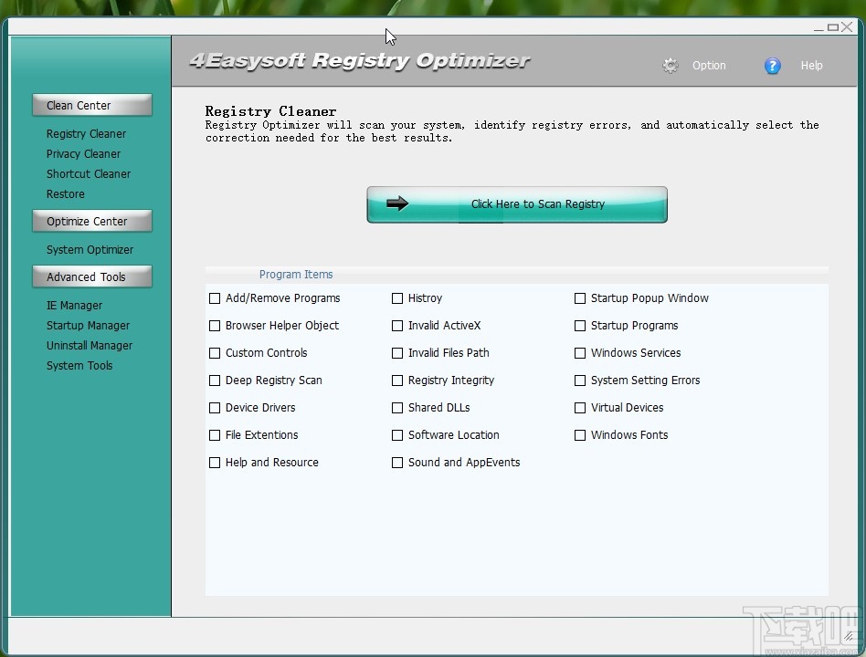 1.首先第一步我们打开软件之后,在界面的左边选择Registry Cleaner这个选项,点击之后进入到清理操作界面,勾选界面中想要扫描清理的一些选项之后,点击界面中的“Click Here to Scan Registry”这个按钮。