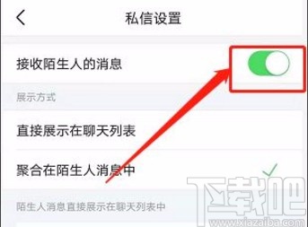 5.随后在私信设置页面中,我们在页面上找到“接收陌生人的消息”选项,其后面有一个开关按钮,我们点击该按钮将其打开。