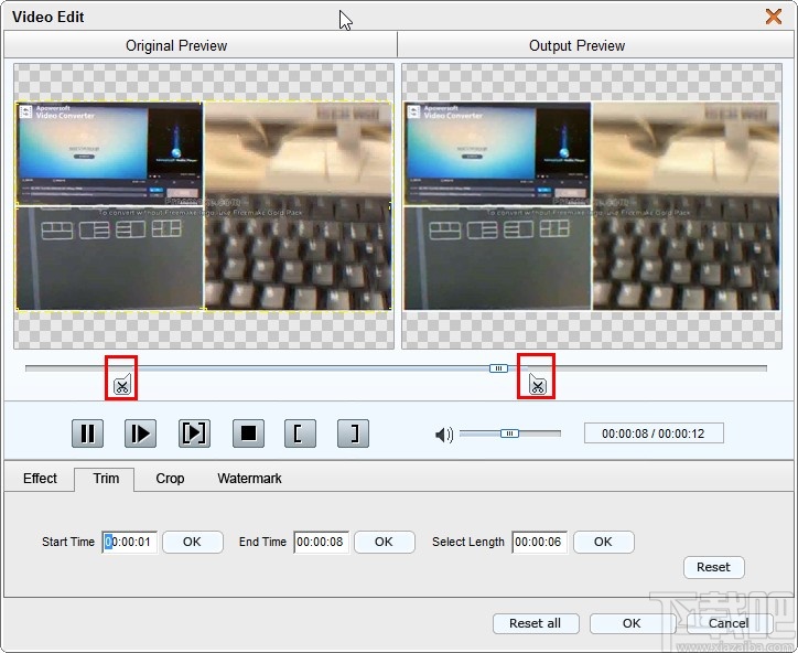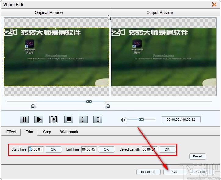 5.选择好想要剪切的位置之后,下下方可以看到具体的设置开始时间和结束时间,还有剪切的总时间长度,点击OK按钮确认剪切。