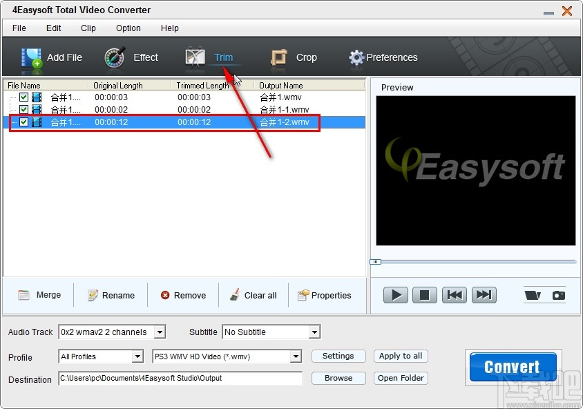 3.点击打开按钮添加文件到软件界面之后,我们选中想要剪切的视频文件,点击上方的Trim这个剪切功能图标。