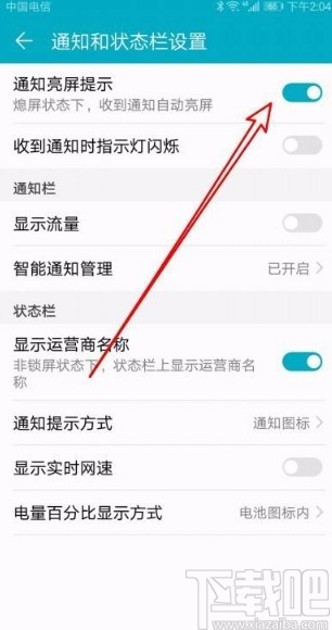 5.最后我们点击“通知亮屏提示”选项后面的开关按钮使其处于打开状态,就可以完成新通知亮屏的全部设置了。