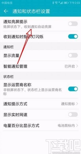 4.接下来在通知和状态栏设置页面中,我们在页面上方可以看到“通知亮屏提示”选项,该选项后面有一个开关按钮。