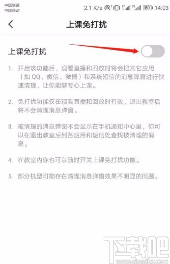 5.然后就会进入到上课免打扰页面,我们在页面上找到“上课免打扰”选项,其后面有一个开关按钮,点击该按钮将其打开。