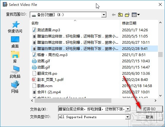 2.点击这个添加文件的按钮之后,打开添加文件的界面,在这个界面中我们选中目标视频文件之后点击右下角的打开按钮。