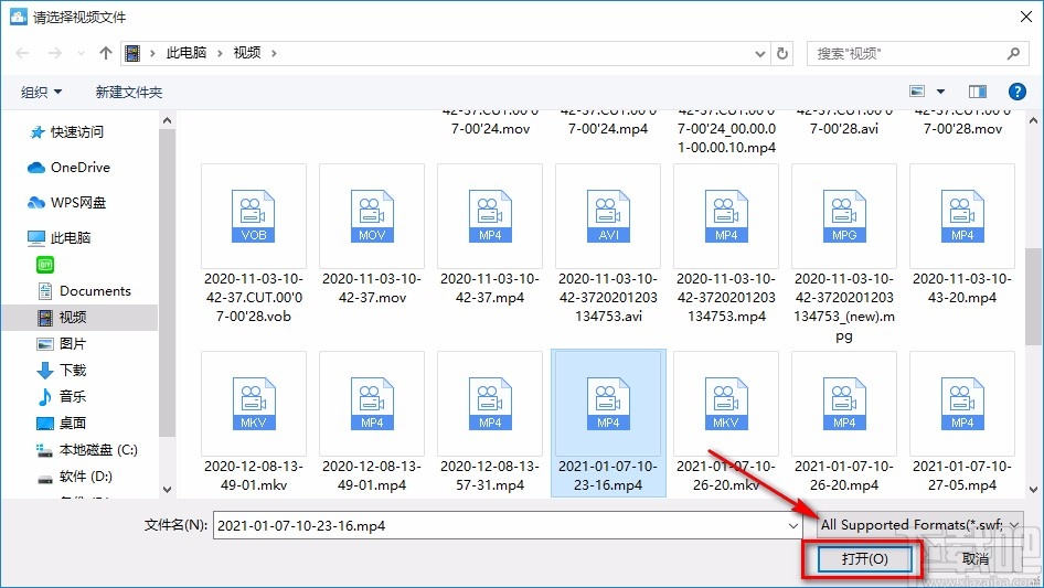 3.在文件添加页面中,我们将需要截图的视频选中,再点击页面右下角的“打开”按钮就可以了。