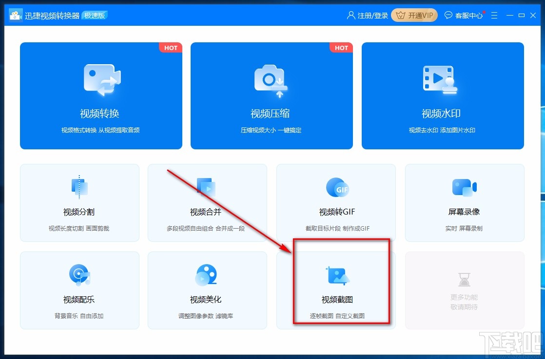 1.首先打开软件,我们在界面右下方找到“视频截图”选项,点击该选项就可以进入到视频截图页面。