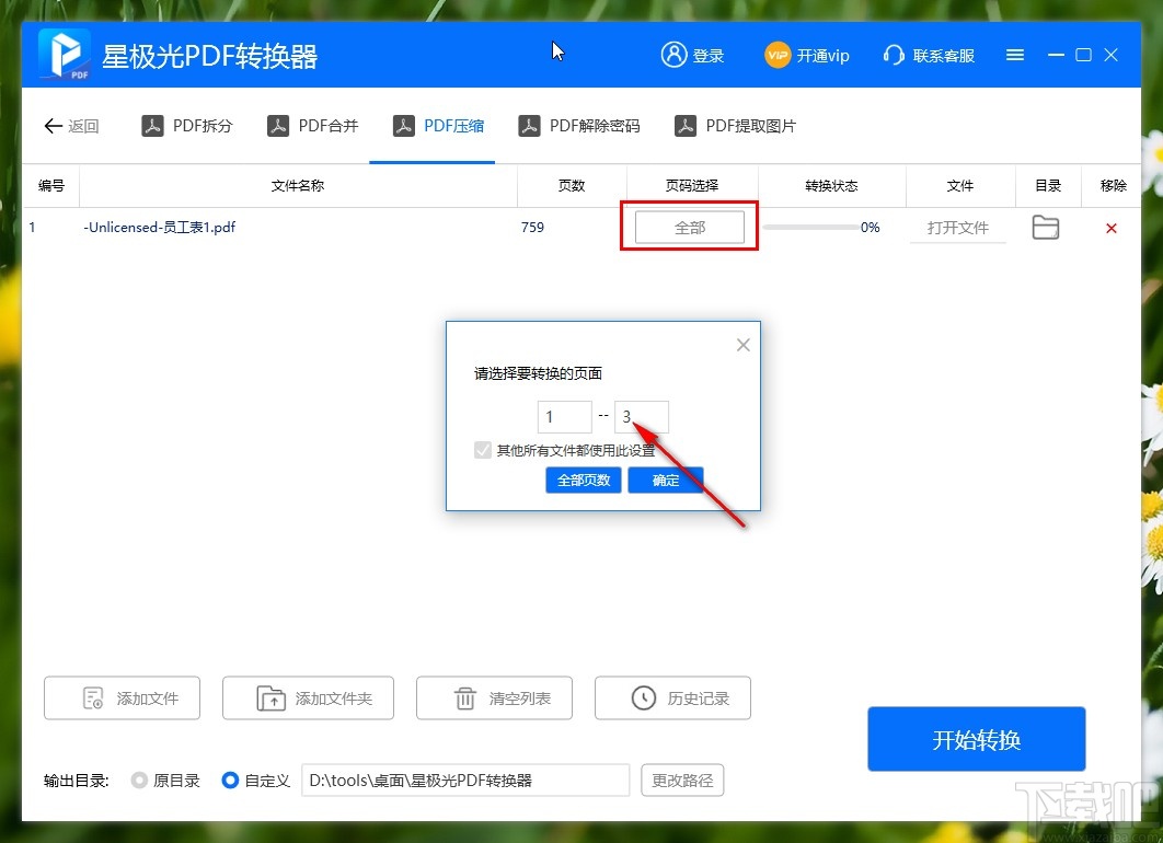 4.点击这个打开按钮成功添加文件到软件界面之后,点击页码选择下方的按钮可以打开选择想要转换的页面范围的窗口,如下图中所示。