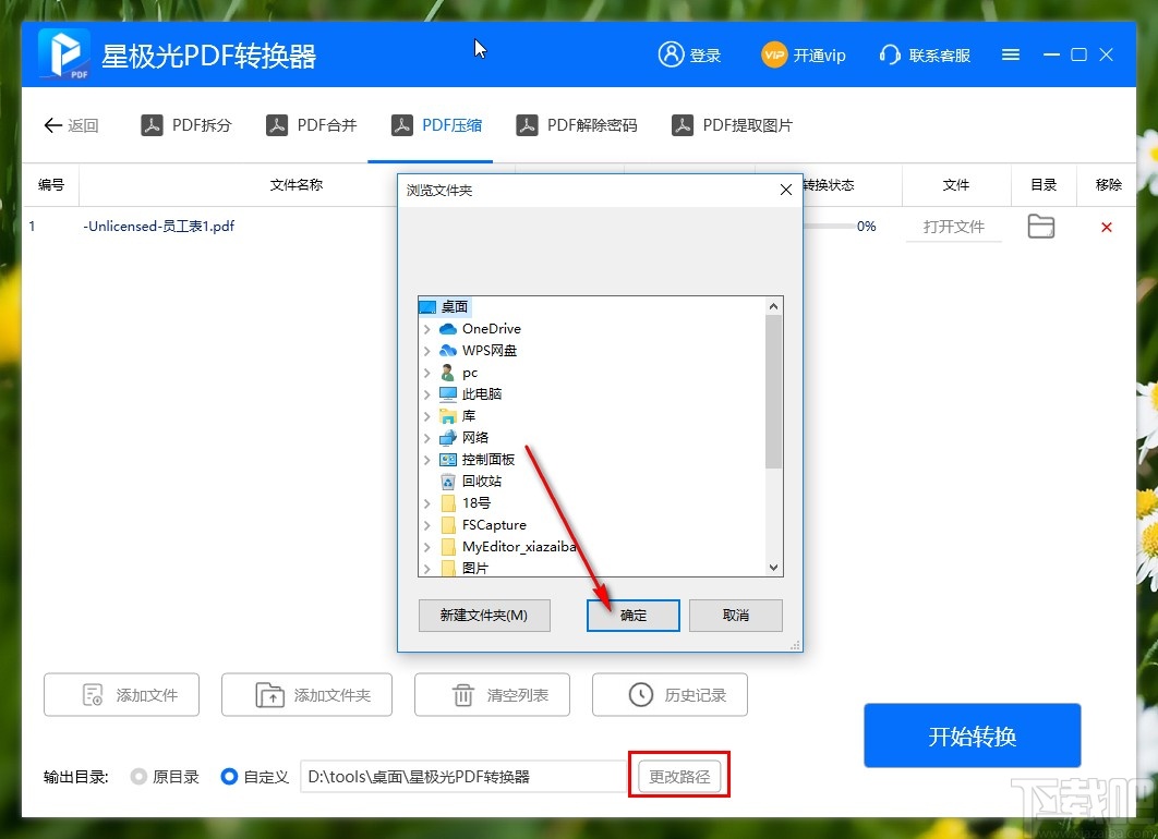 6.下一步根据自己的需求设置好输出路径之后,在界面的右下角点击开始转换按钮,点击之后即可开始压缩文件输出保存。