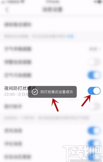 5.最后点击“夜间防打扰模式”选项后面的开关按钮将其打开,界面上就会出现“防打扰模式设置成功”的提示,如下图所示,这就表示成功开启夜间防打扰模式了。