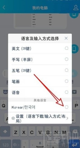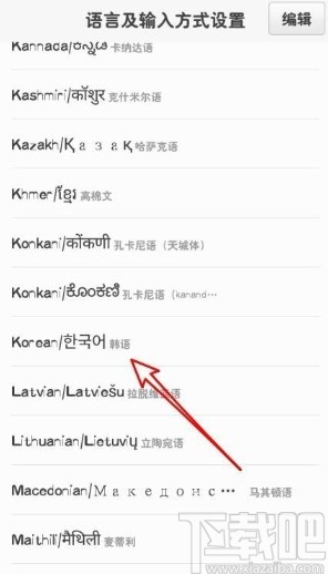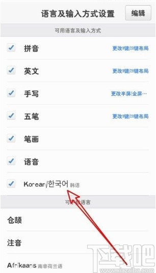 3.点击进入到这个设置界面之后,在出现的语言及输入方式设置界面,找到韩语这个输入选项,然后点击选择它。