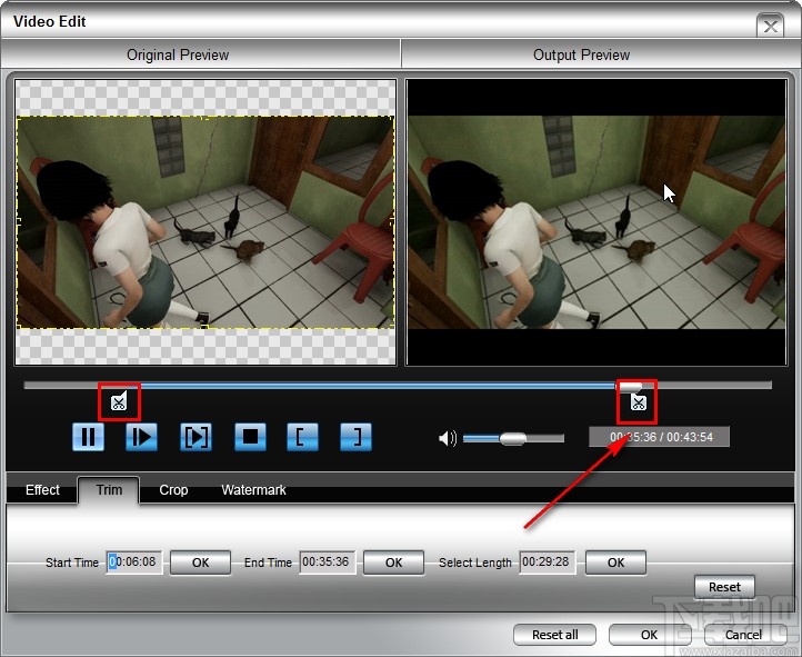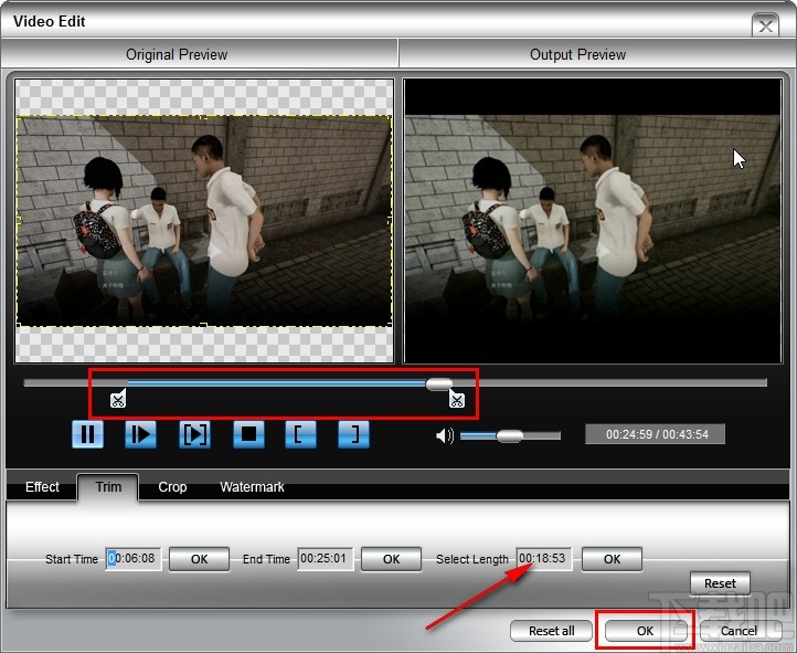 5.设置好这个开始时间和结束之间之后,可以看到选取的剪切片段总长度,在界面的右下角点击OK按钮即可确定剪切操作。