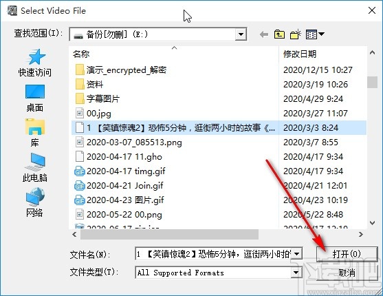 2.点击之后接下来下一步就打开一个选择文件的界面了,在这个界面中我们选中目标视频文件之后,点击右下角的打开按钮。