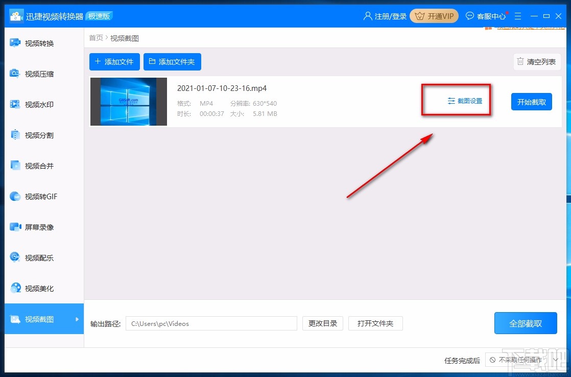 3.将视频添加到软件后,我们在界面右上方找到“截图设置”选项,点击该选项就可以打开截图设置窗口。