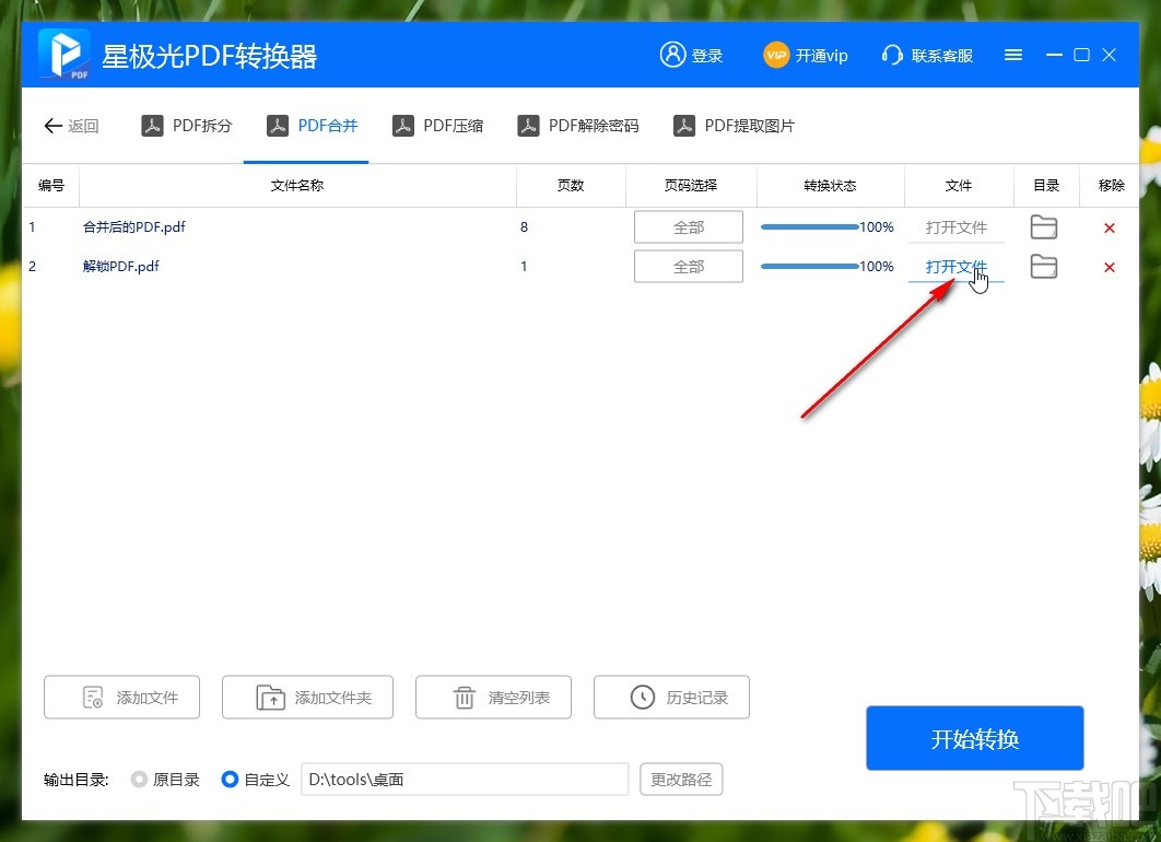 6.点击开始转换之后等待一会,转换完成了就可以在界面的右上角看到转换完成的提示了,点击打开文件选项可以打开合并的PDF文件查看。