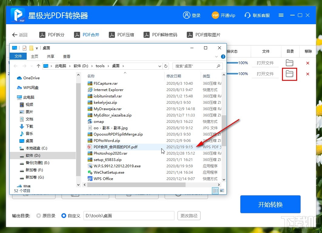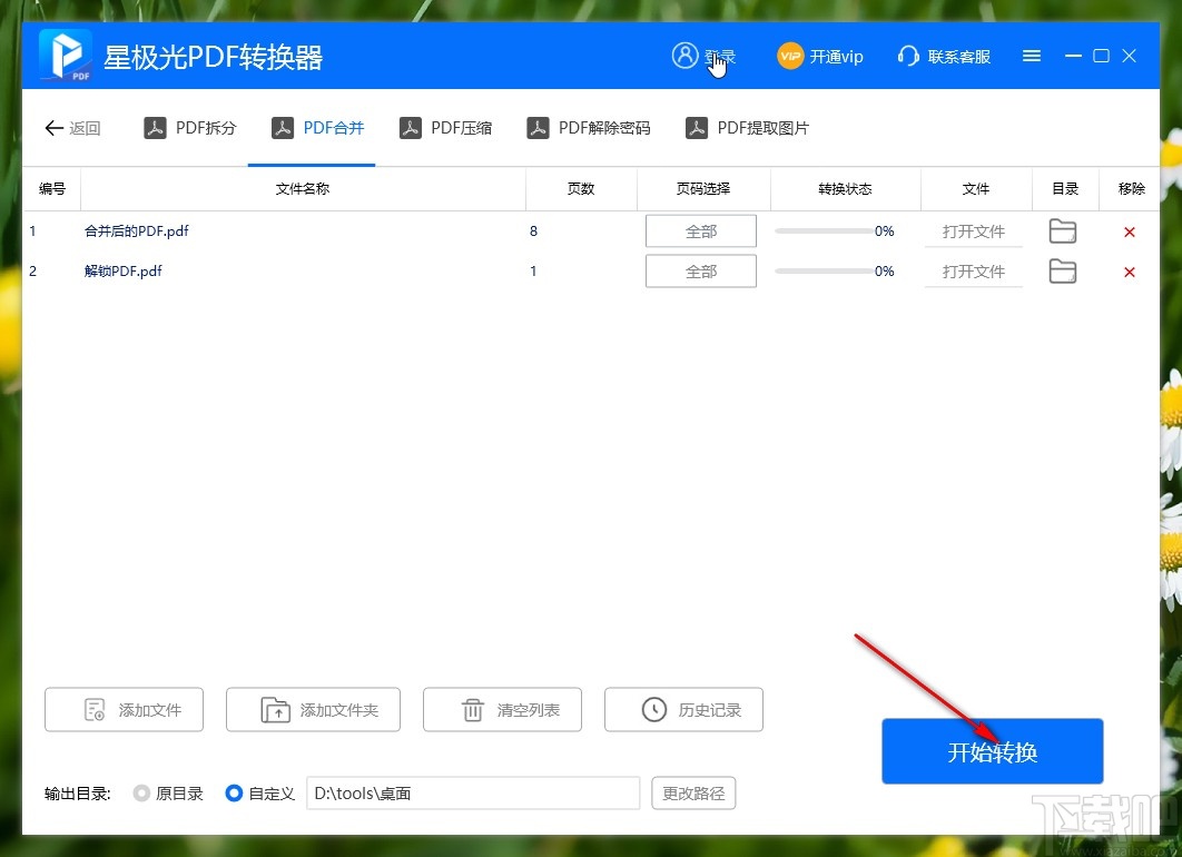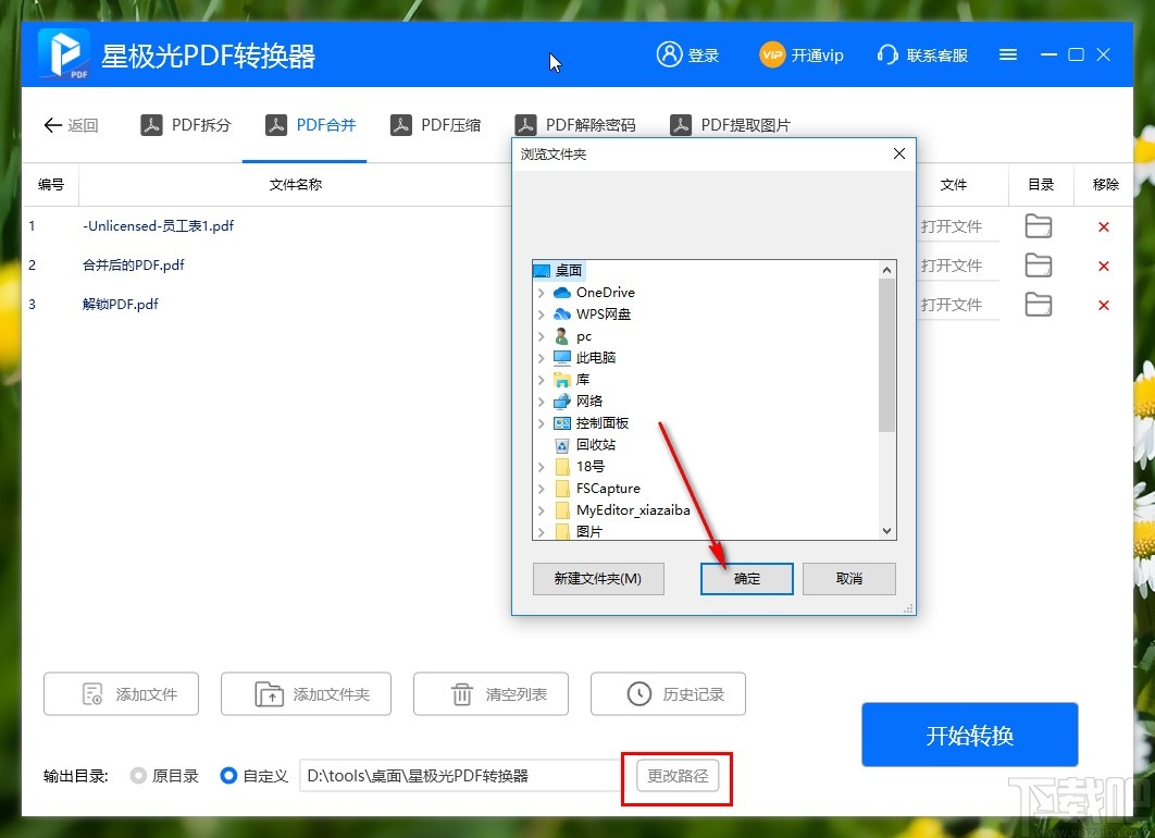 5.选择好合并输出保存路径之后,下一步我们在界面的右下角找到开始转换按钮,点击之后即可开始合并PDF文件。