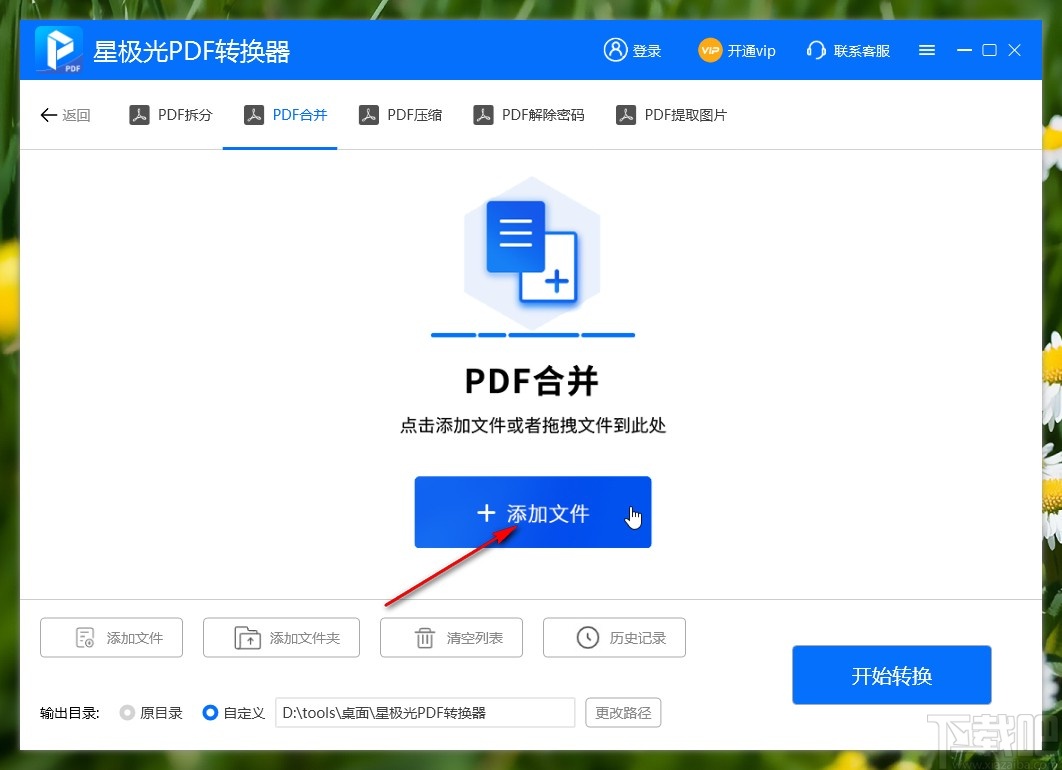 2.进入到PDF文件合并功能界面之后,找到添加文件按钮之后,点击它准备选择想要合并的PDF文件。