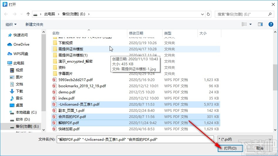 3.点击合并PDF文件之后,在打开的选择文件界面中,选中目标PDF文件,点击右下角的打开按钮即可添加。