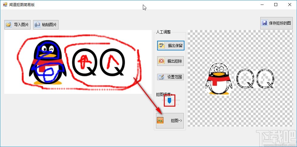 4.选取描出之后,红色笔的位置表示要抠除的位置,蓝色笔的位置表示要保留的位置,描绘完成之后点击下方的抠图按钮。