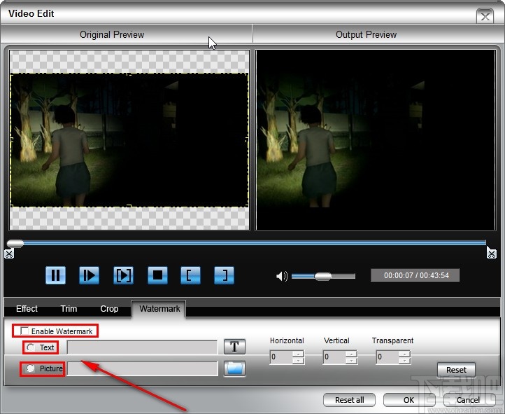 4.点击进入到编辑视频的界面之后,我们在界面的左下角可以看到有“Enable Watermark”这个选项,勾选这个选项之后根据自己的需求来选择想要添加水印的方式。