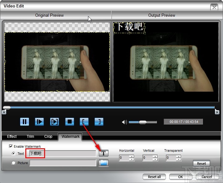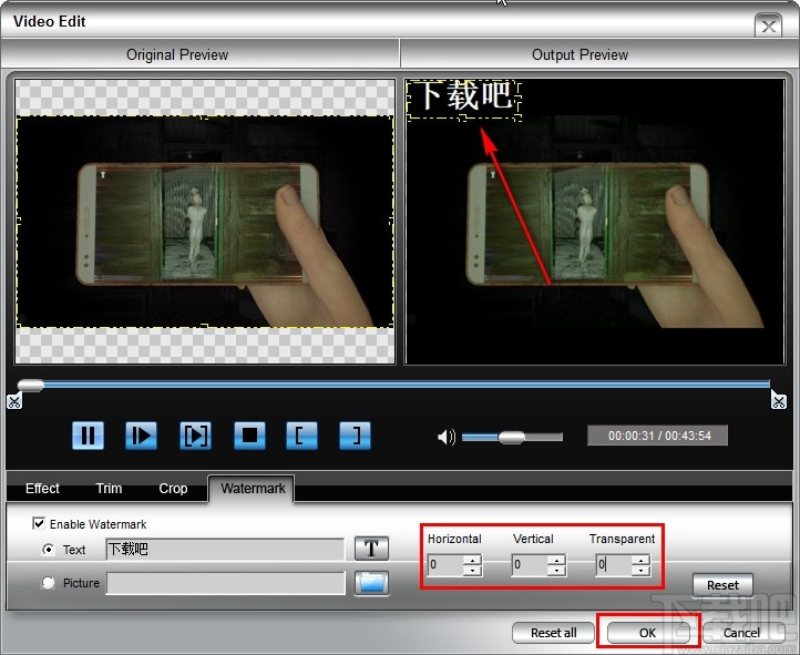 7.下一步点击确定按钮之后可以看到文字水印添加之后的效果,还可以在界面右下方调整水印所在的位置,在界面上方可以看到水印的效果,确认添加的话点击下方的OK按钮。