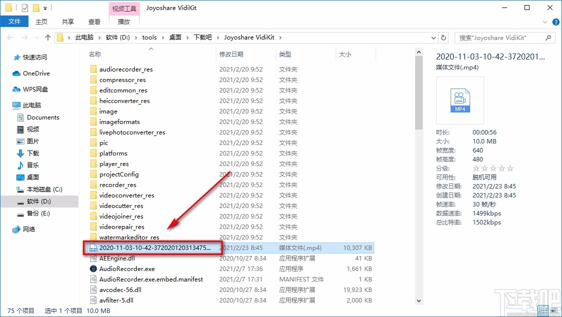 10.将合并后的视频导出软件后,界面上会弹出视频的保存文件夹,在文件夹中就可以找到合并后的视频。