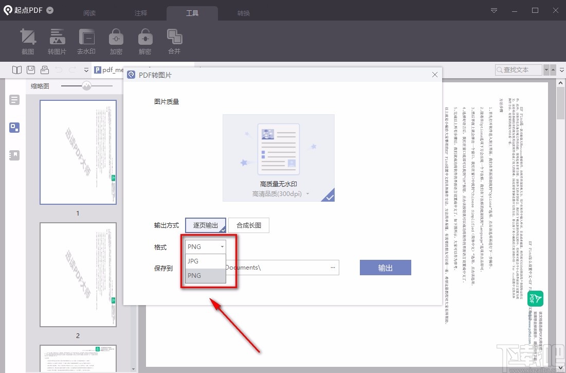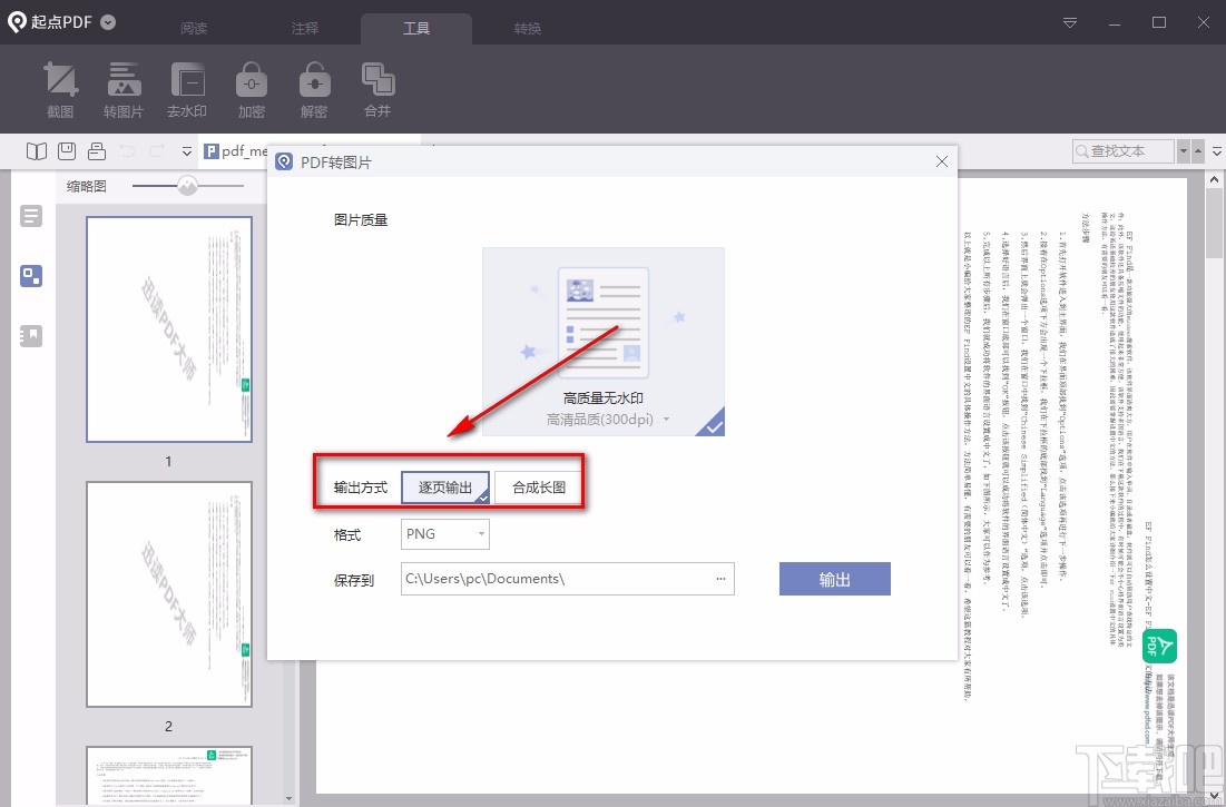 4.然后界面上会出现一个PDF转图片窗口,我们在窗口中找到“输出方式”选项,根据自己的需要在其后面进行设置。