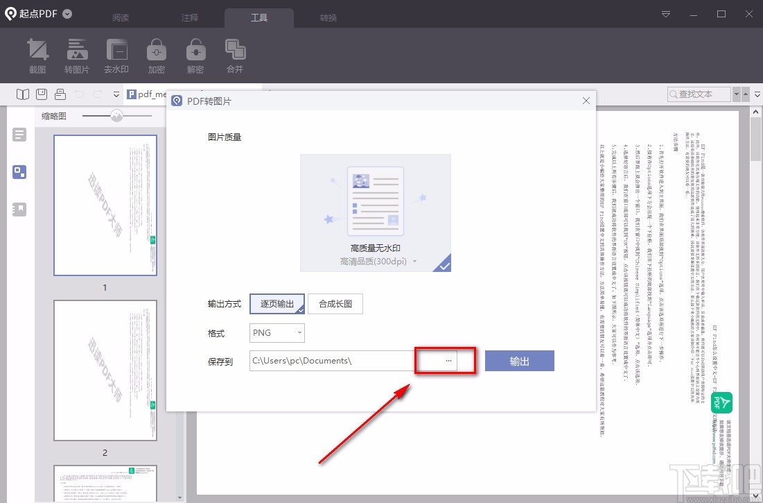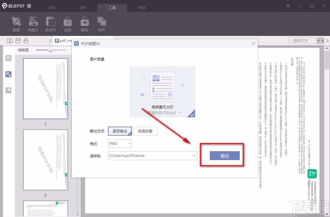 8.完成以上所有步骤后,我们在窗口右下角找到“输出”按钮,点击该按钮就可以开始将PDF文件转为图片并将其导出软件。