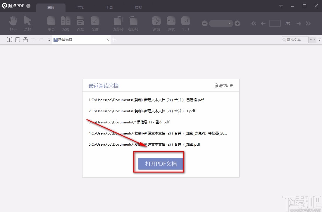 1.首先打开软件,界面上会出现一个窗口,我们在窗口底部找到“打开PDF文档”选项,点击该选项即可。