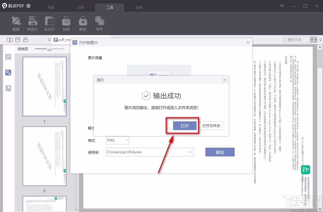 9.文件导出完毕后,界面上会弹出一个输出成功的提示窗口,我们点击窗口底部的“打开”按钮就可以查看转换后的图片。