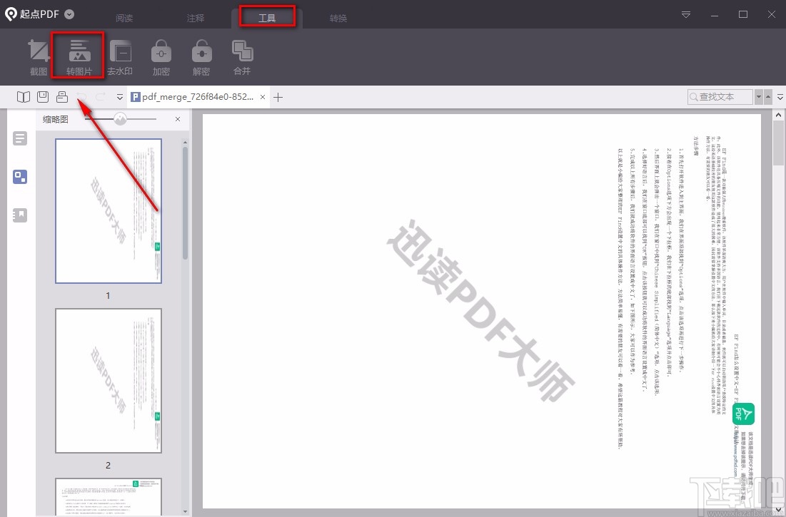 3.将PDF文件打开后,我们在界面上方点击“工具”选项卡,并在其下方点击“转图片”选项,如下图所示。