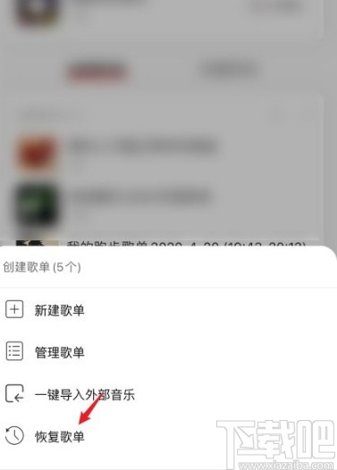 3.点击这个三点菜单按钮之后手机界面下方会出现一个操作菜单,找到其中的恢复歌单这个选项并点击,如下图中所示。
