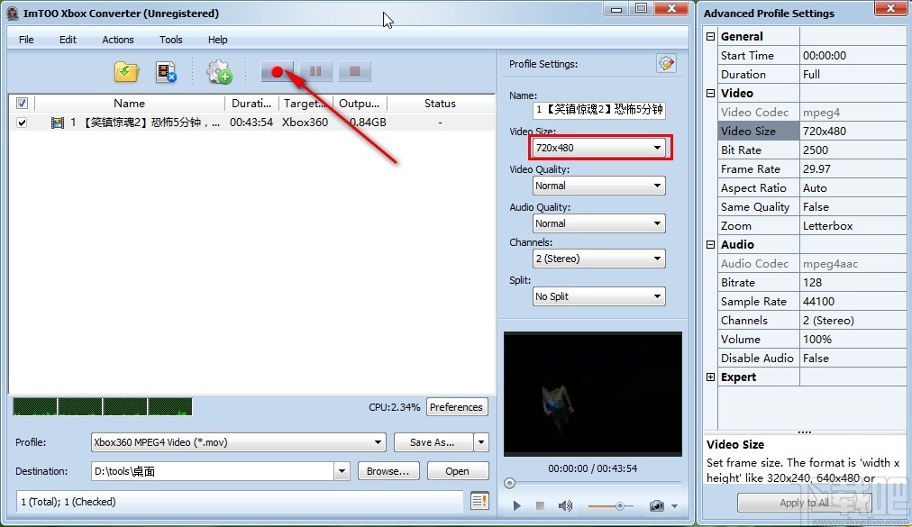 4.打开这个视频参数的设置界面之后,我们找到Video Size这个设置选项,点击它右边的下拉列表即可选择想要的尺寸。