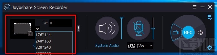 3.在窗口左侧可以看到一个视频录制区域按钮,其旁边有一个下拉按钮,点击该按钮就可以出现的下拉框中设置录屏框的大小;也可以直接点击录屏按钮。