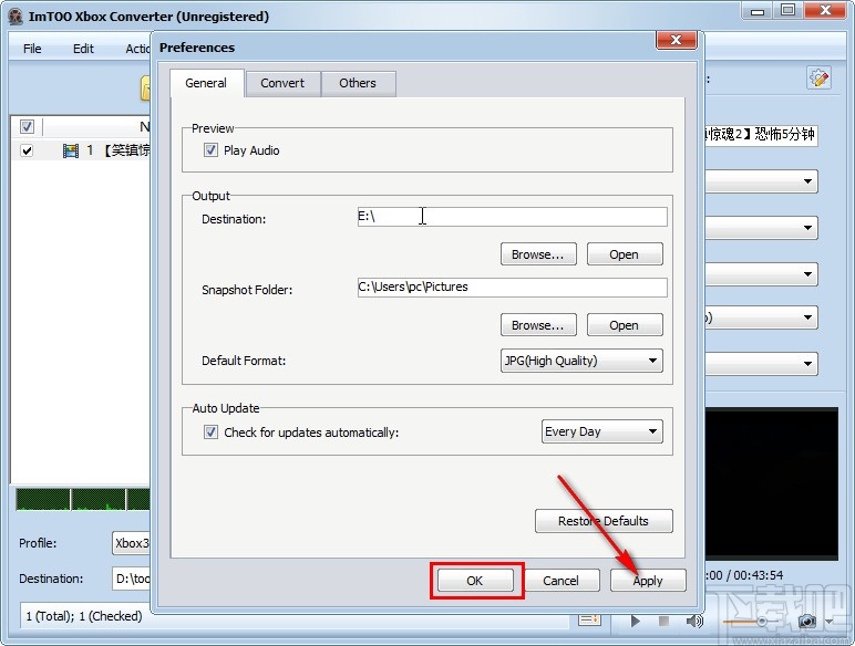 5.点击这个确定按钮选择好输出路径之后,在界面的右下角点击Apply这个按钮先应用修改,最后点击OK按钮保存修改。