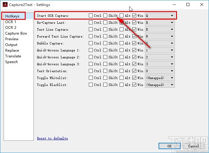 1.首先第一步我们打开软件之后,在左边找到“Hotkeys”这个选项,找到这个选项之后可以看到它的界面中“Start OCR Capture”这个选项,表示截图识别的快捷键,我们可以自己修改快捷键的按键组合。