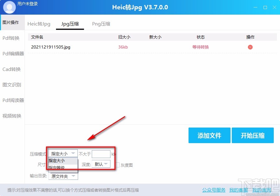 3.将JPG图片添加到软件后,我们在界面左下方找到“压缩模式”选项,点击该选项后面的下拉按钮,在下拉框中设置压缩模式;如果选择“指定大小”选项,则还需要在其后面的文本框中输入图片的大小。