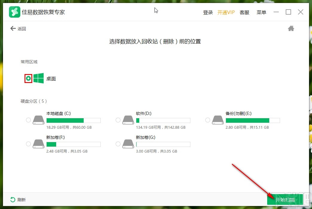 2.接下来下一步我们在界面中选择文件之前所在的位置,选择之后点击右下角的开始扫描按钮,即可开始扫描能够恢复的回收站数据。