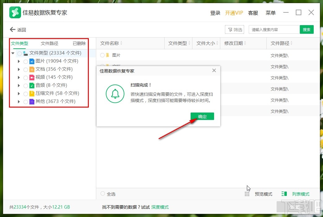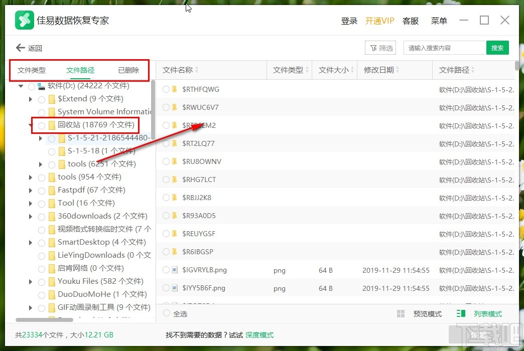 4.在左边的文件列表中还可以切换文件的排列方式,有文件路径和文件类型,根据自己想要恢复的文件的性质来切换查找想要恢复的回收站数据。